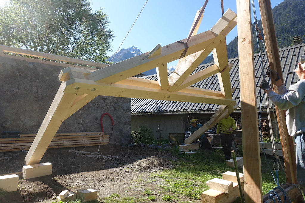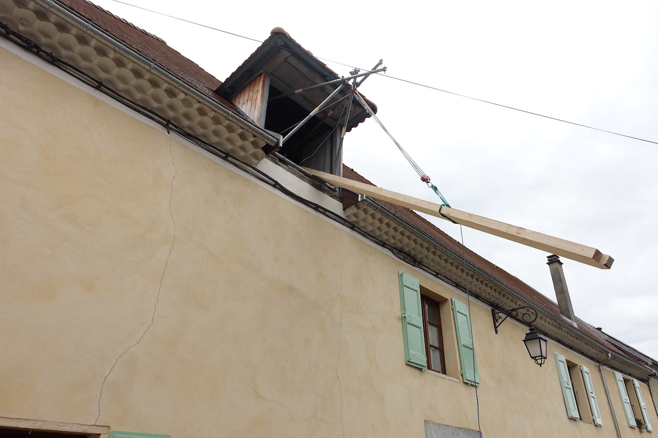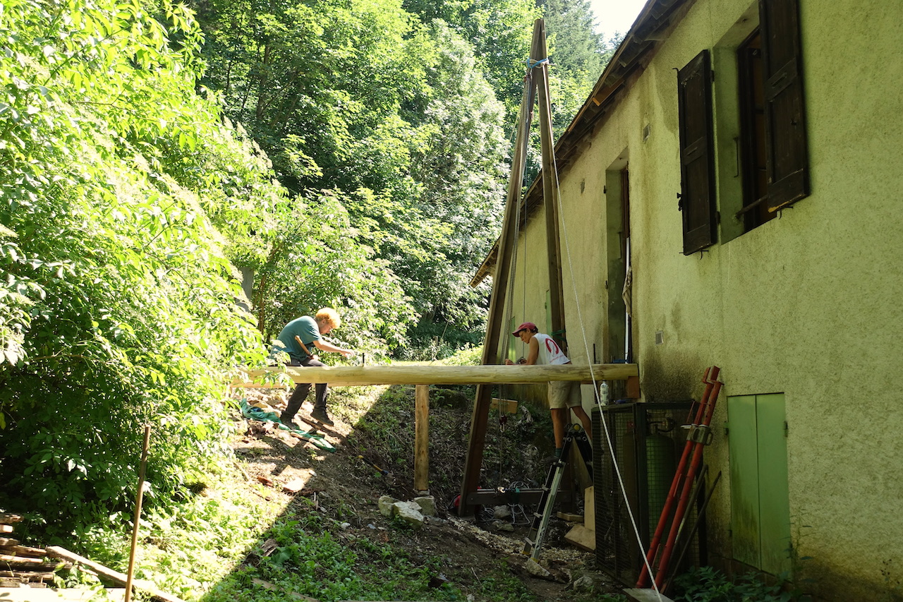 Avec des démultiplications réalisées à l’aide de poulies, nous pouvons lever des charges de plus d’1T sans forcer, sans abîmer le terrain avec un engin et sans bruit !